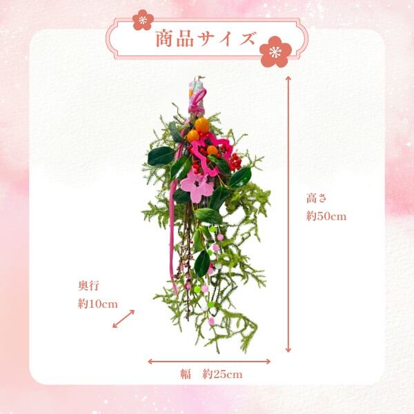 日陰カズラ、桃、椿の葉、南天の実、キンカン、ボンボリ、さくらフェルト(色が変わる場合があります)