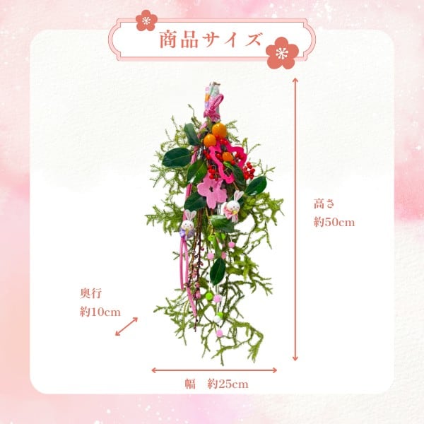 日陰カズラ、桃、椿の葉、南天の実、キンカン、ボンボリ、さくらフェルト(色が変わる場合があります)、ひなうさぎピック