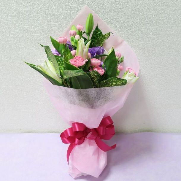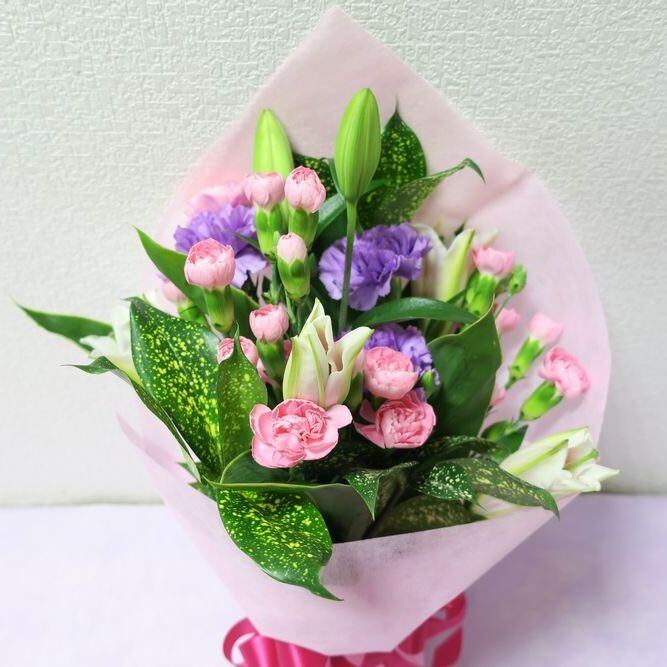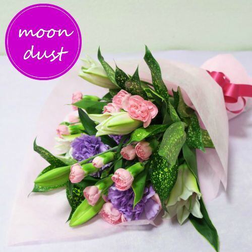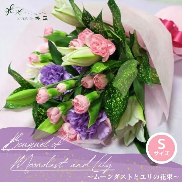 母の日限定 花束「ムーンダストとユリの花束 S」ムーンダスト 紫のカーネーション ユリ ブーケ 生花 ギフト プレゼント 贈り物 感謝 ありがとう マザーズデー【配送日:5月11日(木)~5月14日(日)】